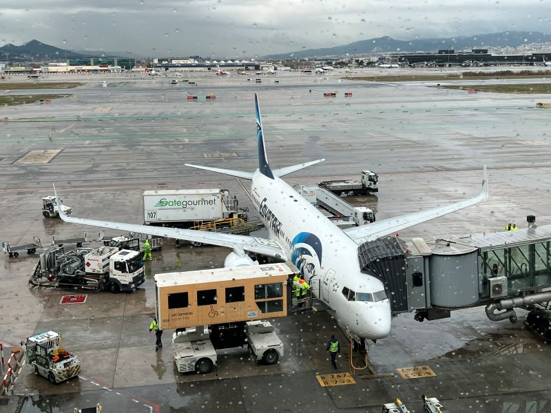 上記のGetYourGuideトラブルはポルトガルで対応済で、ここからは、バルセロナ出発からである。我々が搭乗するエジプト航空の飛行機は、出発時間になってやっと到着した。下写真がその時の様子。飛行機が到着するとすぐに多くの車がやってきて作業が始まったところである。