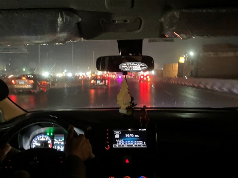 次はパスポートコントロール。どこの空港でもよくあることだが、並ぶ列によって進みが結構違うことがある。ここでは我々の列は非常に遅かった。事情はわからないが、我々の数組前で一人で10分近く費やす人がいたのである。イライラしたが、でもこれも仕方がない。丁度このころ、タクシードライバーからWhatsAppで連絡が来た。「待たせてしまってるのかな?」と思いつつアプリを見ると、「予定のドライバーが体調不良で、私が代わりにやってきた。」と想定外の連絡であった。そしてドライバーは自分の顔写真を送ってきた。この顔写真で自分を見つけてくれという意図らしい。パスポートコントロールを無事通過(約22:40頃)後、私も顔写真をドライバーに送り、荷物を受け取って、やっと外に出ることができた。よくある空港出口の風景であるが、多くのドライバーがお客さんの名前を書いた札を持って並んでおり、ホントは私の名前もここにあるはずだった。しかし見当たらない。急な交代で名前の札が間に合わなかったのか?次は先ほど入手した顔写真で探すしかない。相手も探してくれるはずだ。そう考えて周りを見回したが、見つからない。空港建物の外の道路まで出ないといけないのか?そう思って外に出て少し探すと、少し遠くから相手が私を見つけてくれたようで、何とか出会うことができた。相手も遅れて今来たところのような雰囲気であった。私が荷物を受け取って外に出てきたのが約22:45くらいなので、到着から1時間後。空港によっては、到着から45分で出てくるのは結構厳しいのかな?という気がしたが、今回は偶然ドライバー側もトラブルで遅れ、結果的にはうまくいった。