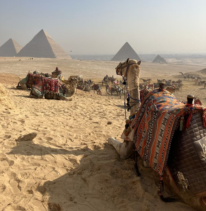 エジプト人の時間感はよく知らないが、ツアーガイドさんがやってきたのは9時の約束に対して9:25頃だったか? まあそんなものかと思いながら、早速出発した。ただ、時々苦労することもあるが、基本日本語で意思疎通できるのは非常に楽だし、ここエジプトで何も気にせず車で移動できるのも大変楽であった。最初に向かったのはピラミッドの正面入口。宿とはピラミッドのほぼ反対側になる。ここでチケットを購入し、入場後は無料シャトルバスで移動し、最初に高台のビューポイントに向かった。観光客待ちのラクダもたくさんいた。ピラミッドを背景にしたラクダは絵になる気がする。