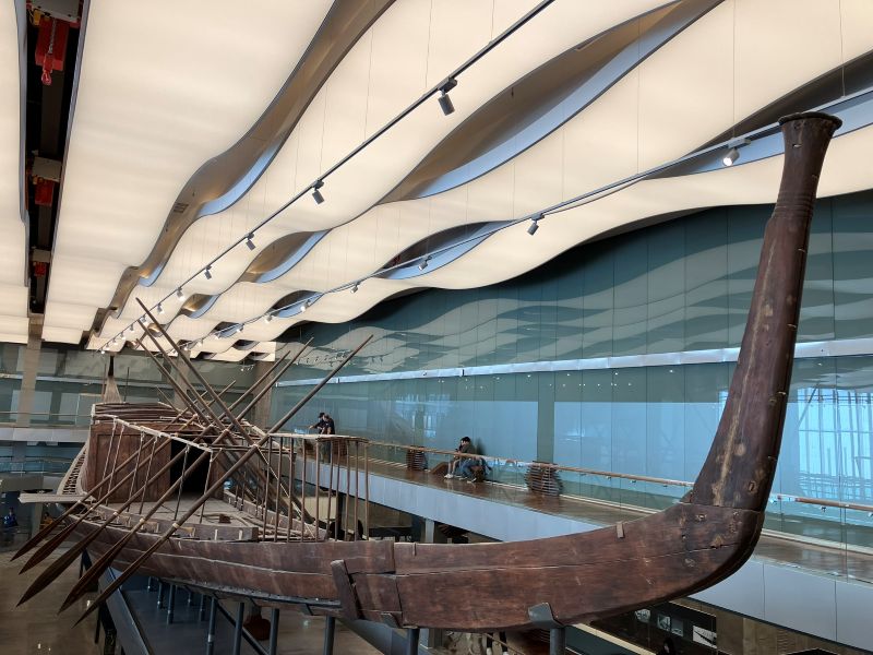 大エジプト博物館の最後には、別館に展示されている「クフ王の太陽の船」を見学した。実際に水上で使用されたのか、儀式のために作られたのか、諸説あるがまだはっきりしていないらしい。しかし、なかなか迫力のある船である。