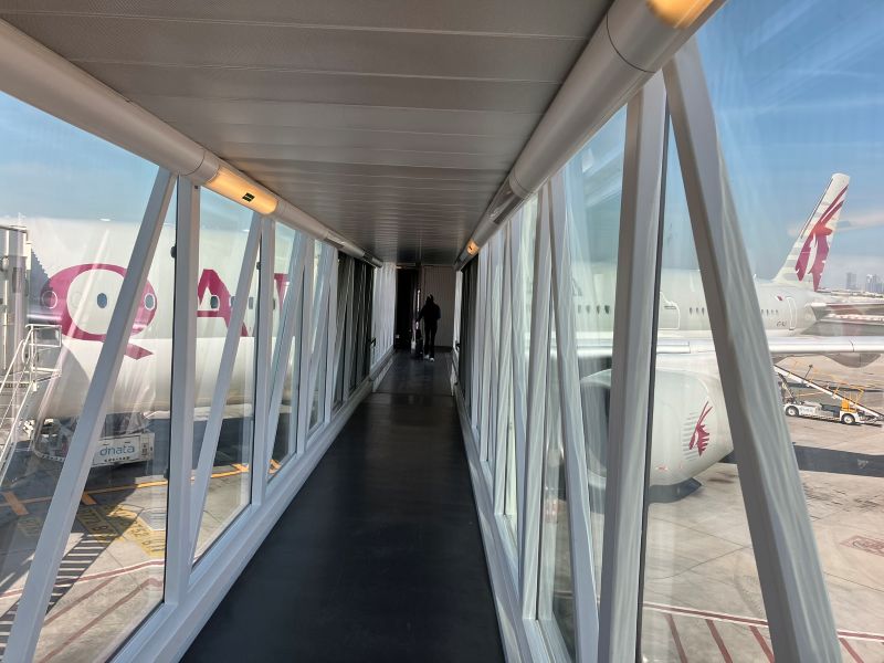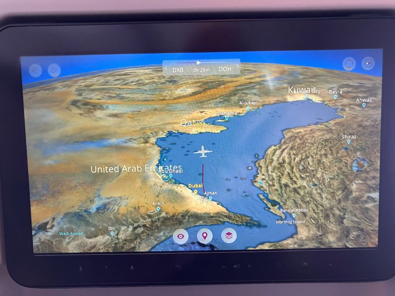 まずドバイからカタールのドーハへのフライト。約1時間のフライトであるが、エコノミー席が横3+3+3席の大型機、かつエアバス最新鋭のA350であった(下写真)。たった1時間のフライトにこの機体? 少し驚きであったが、さすがに最新鋭で機内も結構奇麗であった。
