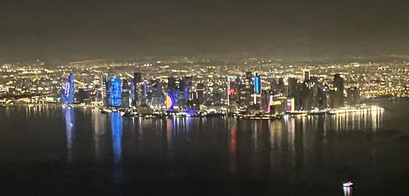 離陸直後には、昼間見た高層ビル群の夜景がたまたま見え、美しかった(ピンボケですが下写真)。その後はすぐに横になり、脱水症防止のために時々水を飲んではトイレに行き、何も食べずに日本まで無事過ごせた。