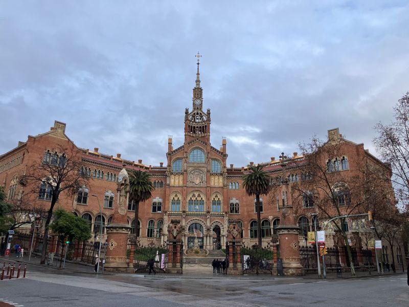 バルセロナ2日目は、丸々観光日。サグラダファミリアとグエル公園は予約してあったので、それに合わせて宿で朝食後に出発した。天気は青空が見えたり雨が降ったり。最初に向かったのは、サグラダファミリア近くのサン・パウ モダニズム区域(下写真)だが、ここは外観をちらっと見たのみ。