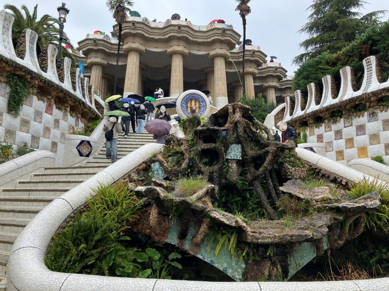 サグラダファミリアの地下の博物館も十分楽しんだ後、バスでグエル公園(下写真)に向かった。公園では生憎の雨となったが、それでも他ではなかなか見られない彫刻や建造物を楽しむことができた。