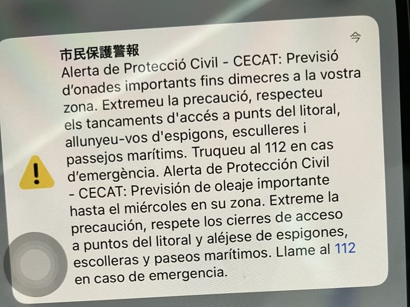 その後、宿に戻って午後のフライトに間に合うように空港に向かった。空港には早く着きすぎて、チェックインカウンターが開くまで少し待ったが、その時その場にいた(多分)全員のスマホが鳴り出し、驚いてスマホを見ると下記のような表示が。スペイン語?で全くわからなかったが、周りの様子からすると緊急性は無さそう。後で訳してみると今後数日間の高波警報みたいで、「海岸には近づくな!」との趣旨の警報であった。