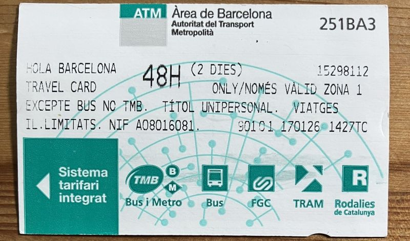 バルセロナには丸々2日間滞在の予定だったので、空港到着後に48時間交通チケット(下記写真)を購入。バルセロナの交通チケットはゾーン制で、空港はゾーン外(主要観光エリアとはゾーンが異なる)なのであるが、このチケットは主要観光エリアゾーン内の乗り放題と空港1往復がセットになっており、我々にピッタリであった。