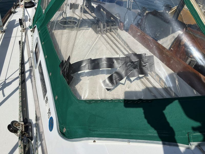 セーリング中にタックをした時に結構大きいバシャっという音がした。その時は何の音か分からなかったが、後からドジャーの透明部分が破れているのを発見。タックして方向転換後、ジブシートを引き切るまでの間で、ジブセールとジブシートが暴れている時に、ジブシートがぶち当たったようである。これまで一度もこんなことは無かったが、余程運の悪い当たり方をしたのか?或いはドジャーの透明部分が劣化して強度が落ちているのか?取り敢えずダクトテープで応急処置。