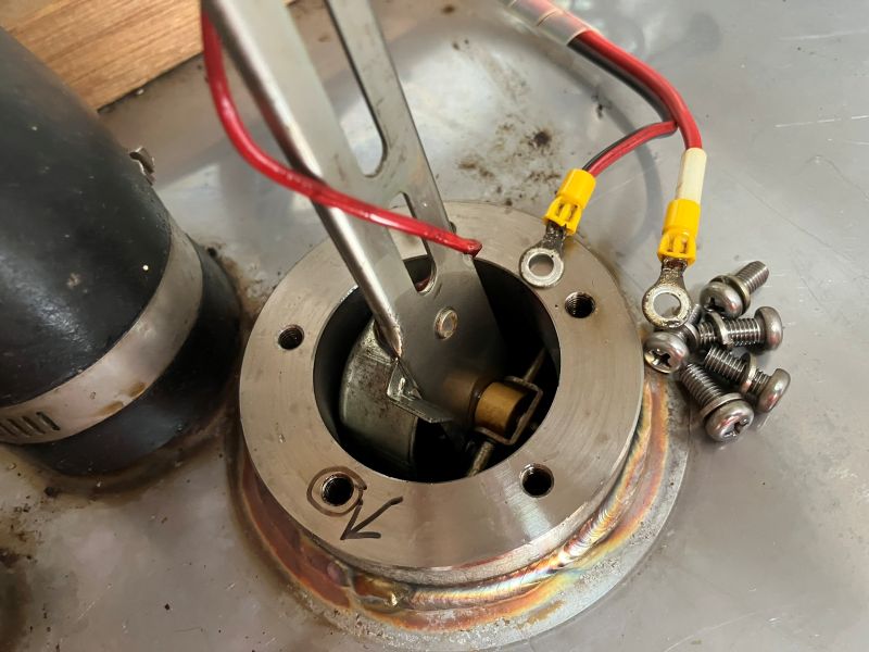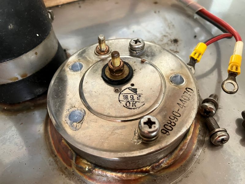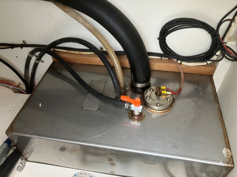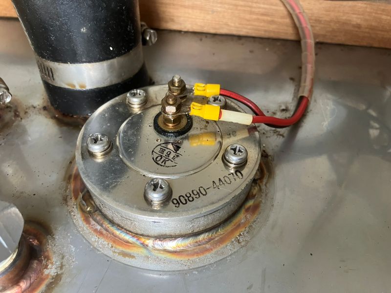 今回は、少し燃料を溢れさせてしまったが、自動停止メカニズムの勉強にはなった。しかしそれだけでは終わらなかった。コックピットロッカー内の軽油臭が、今までになく強いのである。よくよく見ると、下写真の燃料タンクゲージの5本の取り付けネジから、燃料が少しずつではあるが、漏れ出している。ということはネジ周りの油密が悪く、かつ油面がこれ以上になっているということ。空気抜き穴の透明ホースで確認すると、確かに油面がタンク上面より10~15cm程度高くなっていた。とにかくタンク内の燃料を減らして油面を下げることが必要だ!ということでエンジンを暫く回してエンジンで消費することで、まずは油面を下げた。これで、ネジ周りからの燃料漏れも止まった。しかしこれはヨットなので、セーリングすればヒールするし、油面も揺れる。実際この状態でセーリングしてみたが、やはりある程度の軽油が漏れていた。なので、タンク内燃料が一定以上減らないと、時々燃料が滲み出てくるだろう。今まで時々軽油臭を感じていたのも、ここからの漏れが主要因だったような気がする。