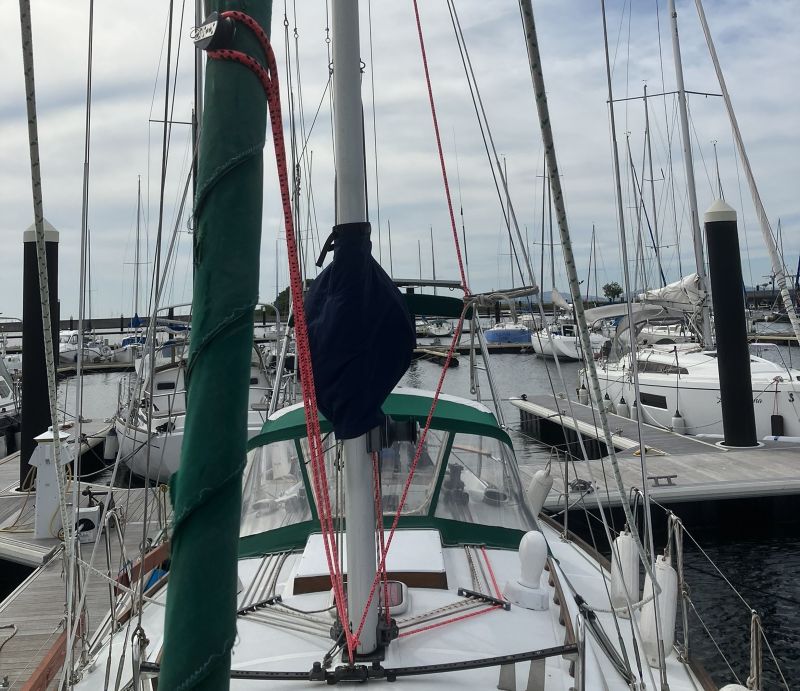 ふと見上げると、約半年前に取り付けたレーダーリフレクタの下側のロープ(下写真の白いロープ)が外れて無くなっている。そしてリフレクタはブラブラの状態。結びが解けたのか、切れたのかわからないが、再度取り付けるためにマストに登った。