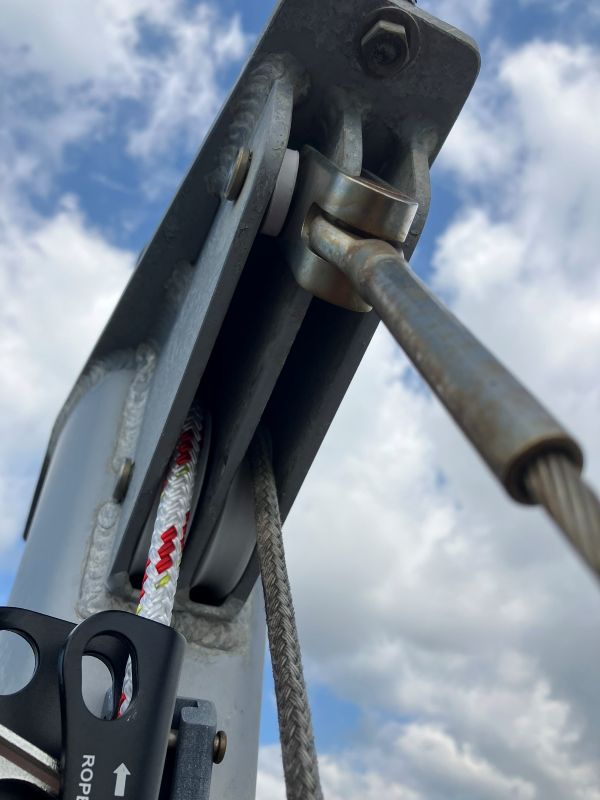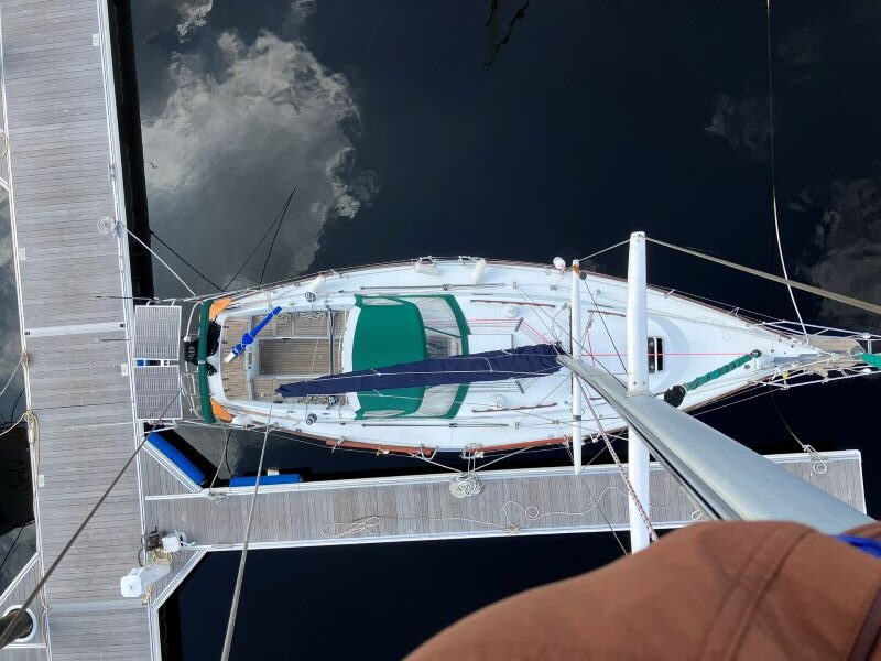 今回はマスト登りついでに、初めてトップまで登ることとした。というのは、風向はOKなのだが、風速が出力されず、トランスデューサー交換の下見をするためである。トップまで登ると流石に高い。景色もいい。が、トップまで登ってみて初めて分かるのは、マストトップで作業するには、少なくとも胸から上あたりはマストトップより上に出したいのであるが、最後の1m程度が簡単には登れないこと。私はメインハリヤードにアッセンダー(下写真左下に少し見える黒い部品)を取り付けて登るのであるが、これは大体自分の顔と同等か高い位置にあるので、マストトップに顔が並ぶ位以上には簡単に登れない。これではマストトップでの作業は困難なので、対策は次回までの宿題となる。また今回ヒヤッとしたのは、高く登りたい思いで、アッセンダーをギリギリまで高い所まで動かすと、アッセンダーを外せなくなること。よく使っている人には当たり前なのかもしれないが。降りるときにはアッセンダーを外す必要があるが、ハリヤードからアッセンダーを外すためには、少し上に動かす必要がある。少しでも高い所へ登りたい思いで、マストの金属部に接触するまでアッセンダーを上方へ動かすと、それ以上上方へ動かせなくなって、アッセンダーが外せなくなる。下に人がいる場合は、ハリヤードを緩めてもらえばいいのであるが、一人の場合はそれもできない。まあもしそうなれば、あとは降りるだけなので、アッセンダーと自分の体を繋いでいるどこかを外せばいいのではあるが、慣れない作業をすると間違えば命とりになるので、あまりやりたくない。何事もやってみれば気付きはあるし、勉強にはなった。