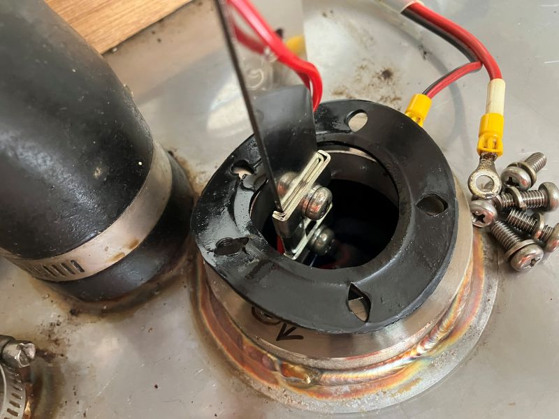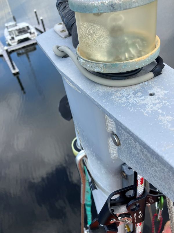 また、初めてマストトップの状態を確認したが、白灯の内部は水滴が付着(下写真)しており、これも早い目に変えた方が良さそう。白灯の後ろに見えるのは、トランスデューサー取付部だが、テープでグルグル巻きになってる。ホントはこのテープの中を確認したかったが、とても作業しようと思える状態ではなかった。尚、写真は片手だけ伸ばしてなんとか撮影している状態。次回、マストトップで作業できる方法考えて、もう一度登った時にトランスデューサーのテープを外して、トランスデューサーも外して持って降りようと思う。多分新品に交換することになると思うが。