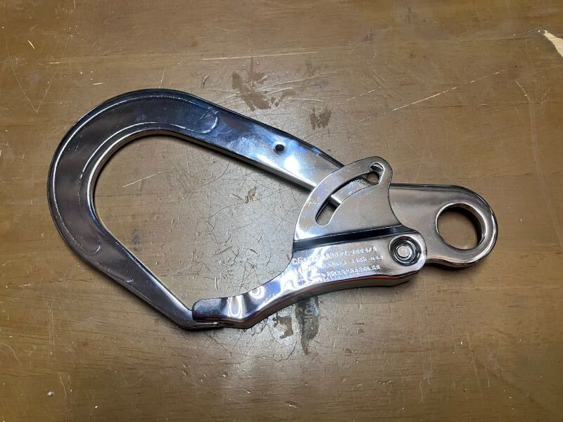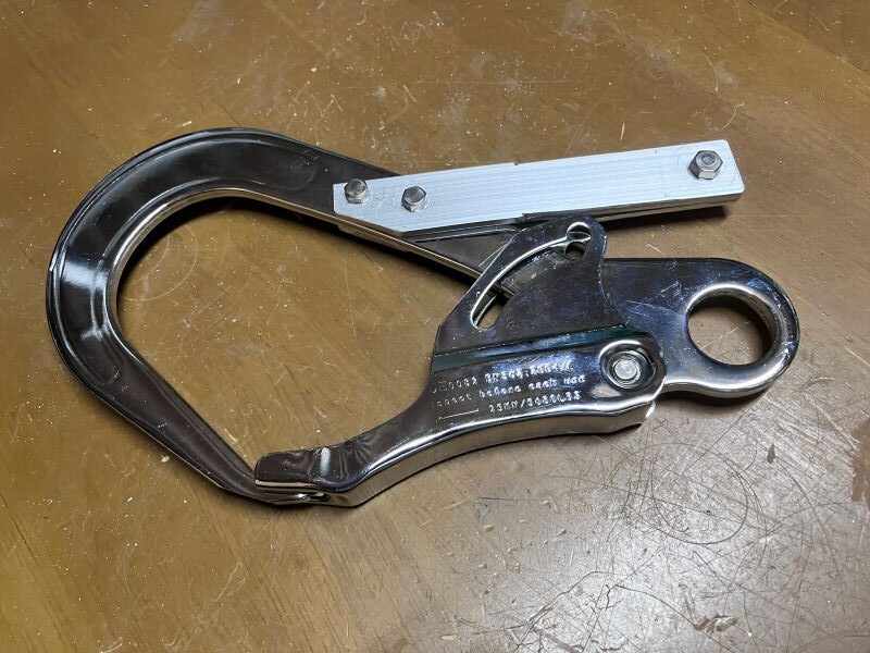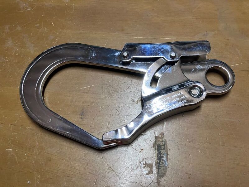 ところが2日前にマリーナに行ったときに、桟橋上でお会いしたYさんから、Yさんが自作されたムアリングフックを見せて頂き、「このフックの方が絶対係船環を拾いやすいはずだ!」と感じ、早速作ってみることとした。購入が必要なものは下記写真のセーフティフック。これは帰宅後アマゾンで発注し翌日入手。