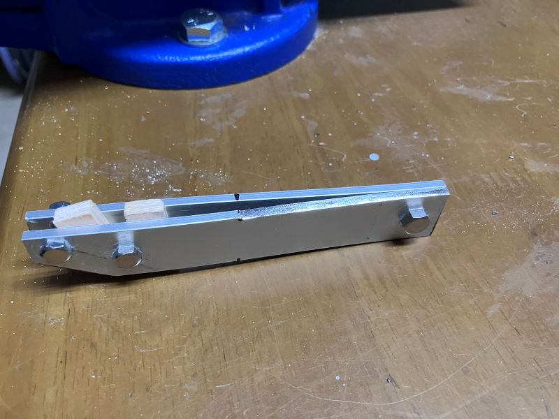 しかし上写真のように組み付けてしまうとアルミ加工が非常に困難になるので、一旦フックと同じ厚さの木材を挟んでパイプに差し込む部分を削ることとした(下写真の右半分)。アルミ部材の上下をΦ20のパイプ内径に合わせて削るのはなかなか難しかったが、現物合わせで少しづつ加工した。