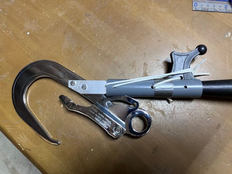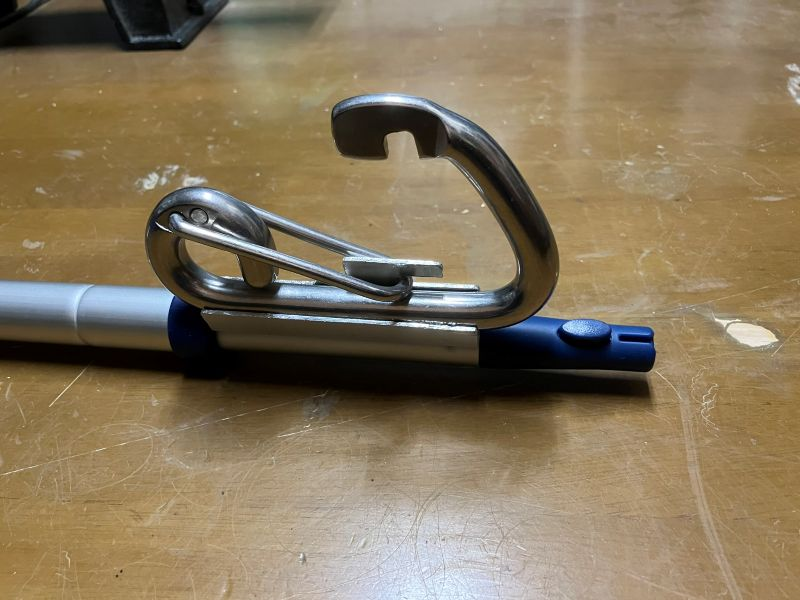 そして下写真が完成状態である。塩ビパイプにはボートフックとの干渉を避けるための溝加工とボートフックに紐で固定するための穴加工を実施(試行錯誤だったので不要な穴も有り)。ボートフックの先端に取り付けて紐で固定し、その塩ビパイプにアルミ部材を差し込んだ状態である。まだ舫ロープは取り付けてないが、セーフティフックの右端の丸穴に取り付ける。書き忘れてたが、フックの可動部の塩ビパイプに接触する部分は、元々円弧状であったものを直線状に除去加工してある。下写真を見て頂ければわかると思うが、この直線部分が塩ビパイプに接することでフックが開いた状態で固定される仕組みである。そしてフックを係船環に掛けた後でパイプをボートフックと共に引き抜くとセーフティフックが閉じるのである。私の製作精度が甘く、下写真の状態でフックが完全に開いた状態ではないが、係船環に掛ける上では問題ないレベルなので、まずはこれで使おうと思う。またパイプが塩ビなので段々摩耗していくとフックがさらに閉じてくるだろうが、頃合いを見て改善したいと思う。少なくとも以前自作したムアリングフックよりは、係船環にうまく引っ掛けられそうな気がする。