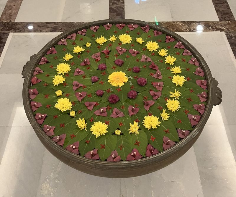 下写真は、ホテルロビーの一部分で、最終日のチェックアウト時に初めて気付いたが、これらの葉や花は水に浮かべて並べられていた。思わず写真を撮ってしまった。