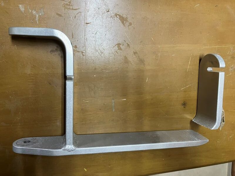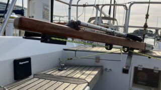 ヨットへの取付は、従来のステーを少し加工して活用することとした。下写真は従来のステーをヨットから取り外し、一部切断した状態。