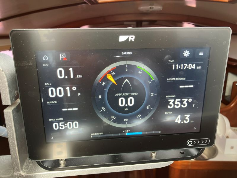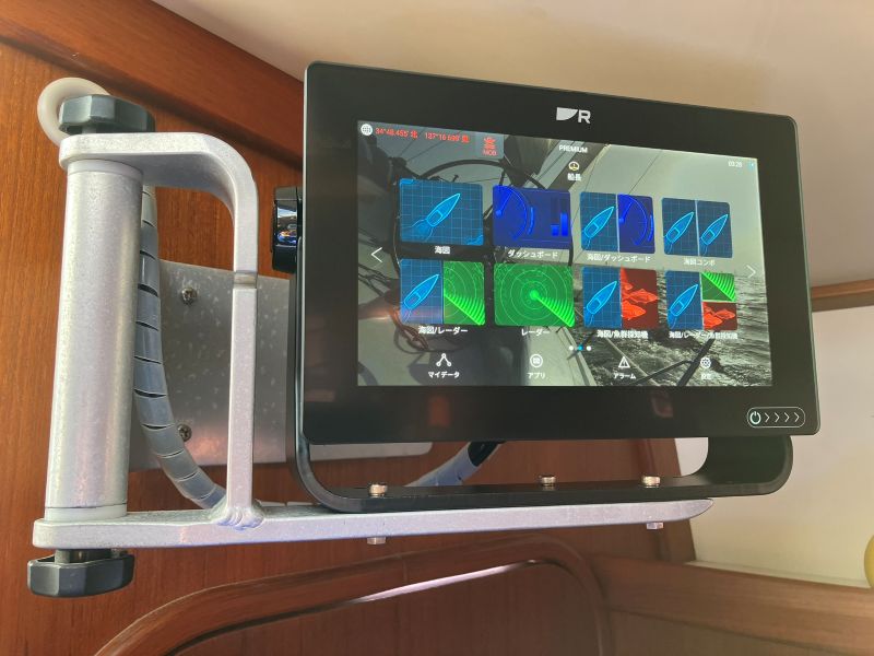 またGPSで場所確認や艇速確認するだけなら、IPADにアプリを入れて使うこともできる。しかし、いろいろな状況での使い勝手を考えて、プロッターを更新することとした。プロッターのお勧めとしては、ホンデックスなどの日本製を推奨されることも多かったが、オートパイロットとの連携や自分自身の調査結果、好み、価格等を総合的に判断して、レイマリンを購入することとした。レイマリンにもいくつかの機種があるが、魚探は不要であることや欲しい機能を比較して、シンプルなAXIOM+9(9インチ)を購入することとした。実はサイズについては、発注直前まで価格優先で7インチしか頭に無かったが、9インチにすると付属の標準ステーが樹脂からアルミになることや、画面サイズが大きくなる割には全体サイズはあまり大きくならない(枠の部分が小さい)ことなどに気付き、直前に9インチに変更。結果的に9インチにして良かったと思っている。