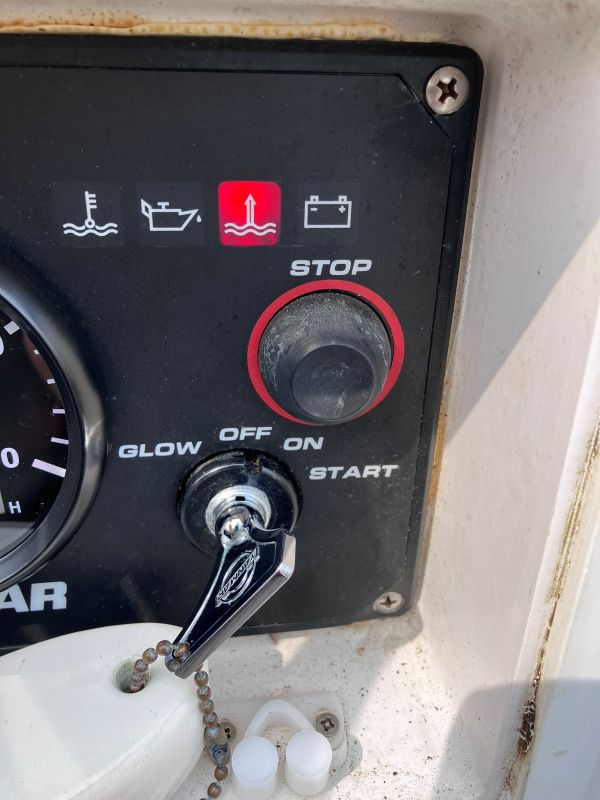 エンジンを回して、センサーの先端を水に浸けてみるとしっかりと警告音が鳴るのを確認できた。下写真は初めて見た浸水警報(浸水検知ランプが赤点灯)。取り敢えずは少し安心である。