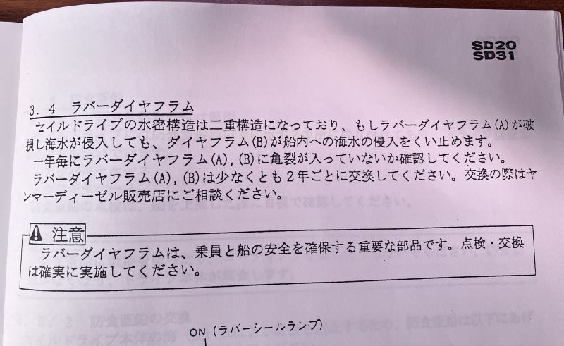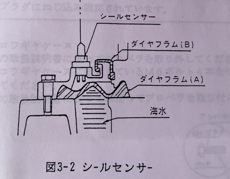 それでもこのヨットを手に入れてから1年、建造20年のヨットなので、交換は大変だし費用もかかるもののいずれ交換しようと考えていた。そして、最近本気でいろいろな方に聞いたり、マリーナに聞いたり、ヨットの専門家などその道のプロの方にも聞いてみた。そしてわかったことは、それだけ聞いてみても予防交換した人はほとんどいないということと、ここからの浸水での事故発生を知っている人はいなかった(私が聞いた範囲ではあるが)。さらにラバーダイアフラムは、ヤンマーでは定期交換部品に指定しておきながら、取り寄せようとしても在庫が無いらしい。納期も正式に注文しないと簡単にはわからないらしいが約数か月とのこと。確かにヤンマーの場合は2重シール構造になっていて、仮にダイアフラムAから浸水があっても、シールセンサーが浸水を検知して警報を発してくれるので、ダイアフラムB(薄くて少し心配だが)から浸水する前に修理すれば大丈夫。