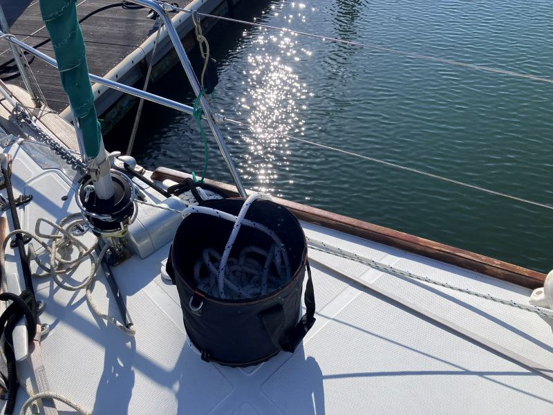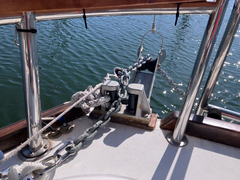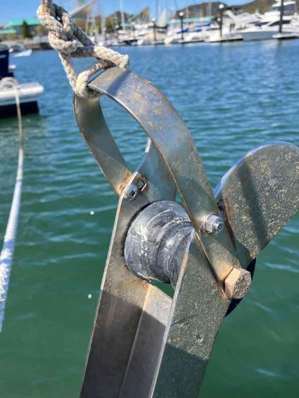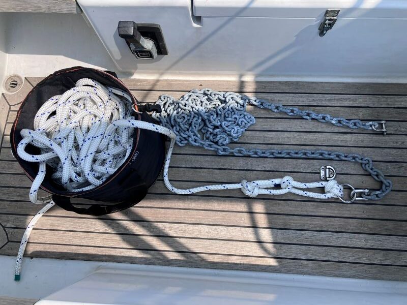ロープをΦ14にしたことで軽くなり取り扱いもしやすくなった(シングルハンドではとにかく作業性の良いことが非常に重要であると感じる)。今回はチェーンを手元に余っていた4.5mのもの(以前バウアンカーに使用していたもの、ウインドラスとスプライス | Exciting Life Beyond the Turning Point)と交換し、ロープとチェーンの結合は錨結びとした。