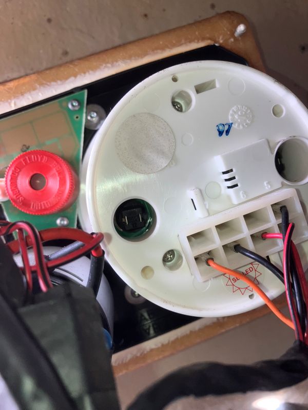 タコメータを入手後は、交換作業である。下記写真は現状タコメータを裏側から見た状態である。周りにあまり余裕スペースは無い。まずは4か所のネジ(星形)を外して、タコメータを取り外した。配線は、最初に白いコネクタごとタコメータから外し、その後ターミナル毎にひっかかりを小さいマイナスドライバーで押し付けると引き抜くことができる。