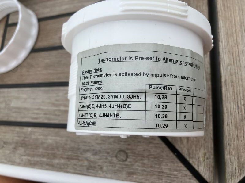 古いタコメータ側面には下記のシールが貼られており、このタコメータは10.29pulse/revであることがわかる。但し、私のエンジン3YM30は、正しくは11.16pulse/revらしい(ヤンマーに確認した結果)ので、新しいタコメータでは11.2に設定した。