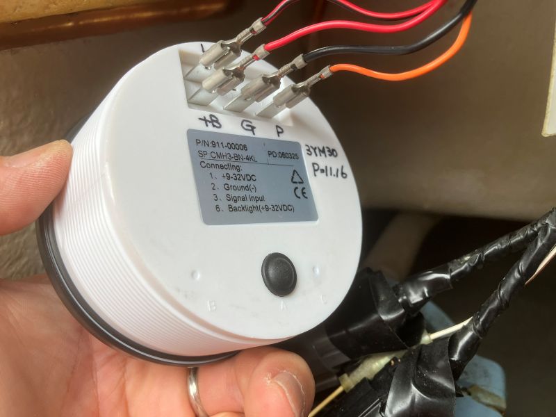 下写真が新しいタコメータにターミナルを仮付けしたところ。同じターミナルがそのまま使えて助かる。この状態でパルス数の設定と作動確認を実施した。