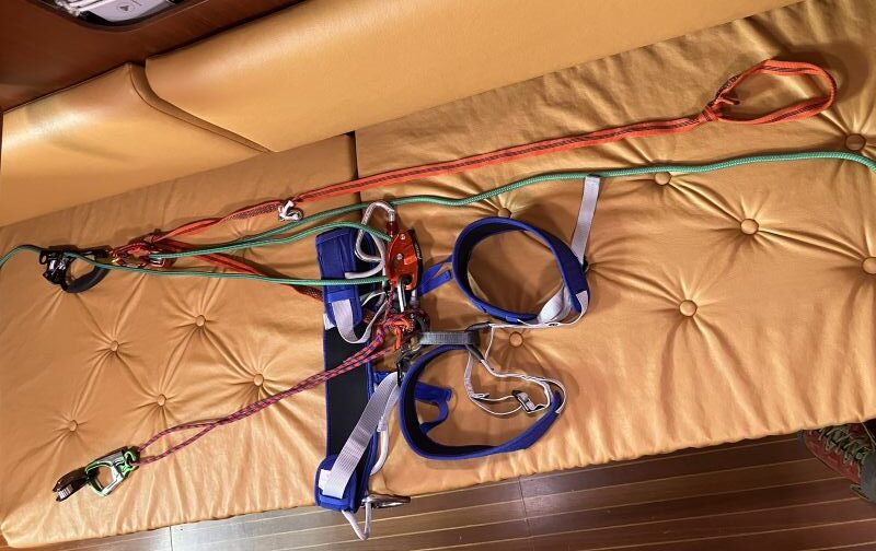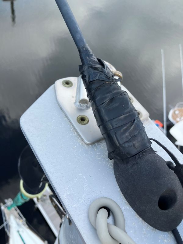私にとって初めてのマストトップでの作業は、不安定で慣れないこともあり、まず下記写真の黒のテープを剥がすのに苦労した。保護テープの性能としては嬉しいのだが、結構しっかりと粘着しているのである。