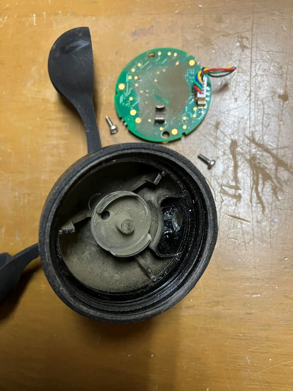 どうせ廃棄なので、興味で構造を確認しようと思い、分解してみた。まず下記は風向計部分である。内部には風向計とダイレクトに繋がった磁石(写真軸芯のシルバー部分)があり、この磁気の変化を直下に配置された電子基盤上のセンサーで検出しているような気がする。
